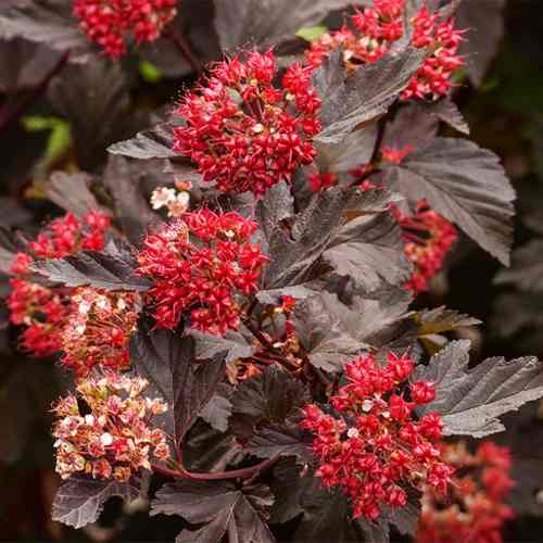Листья пузыреплодника 3-5-лопастные, овальной формы, достигающие размера до 7 см. Они обладают ярким темно-красным окрасом, который летом особенно впечатляет, а осенью превращается в бронзовый оттенок, добавляя разнообразия цветовой гамме вашего сада. К тому же, растение цветет в период с июня по июль, покрываясь бело-розовыми щитковидными соцветиями.
