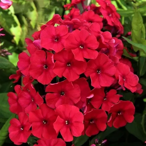 Цветение A.E. Амос — это настоящая феерия красок! Соцветия среднего размера, диаметром около 3 см, выглядят особенно эффектно благодаря своей яркой красной окраске с темно-малиновым глазком. Формой цветки напоминают колесо, что добавляет дополнительный шарм. Цветет флокс в период с июля по август, радуя вас обильным и продолжительным цветением, которое может длиться до 10-12 недель.